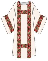 DALMATIKA: Ókori római, bizánci ingruha. Bő ujjas, színes, hosszanti csíkozással ellátott öv nélküli ruhadarab. T vonalvezetésű, kétoldalt nyitott, merevített egyházi öltözék is egyben.