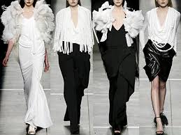 OP-ART ÉS VILÁGŰR LOOK: Geometrikus minták és szabásvonalak alkalmazása a ruhákon. Fekete-fehér illetve fehér-ezüst színekben. A szegélyek és a steppelések kihangsúlyozzák a ruhák és a kabátok trapéz vonalát.
